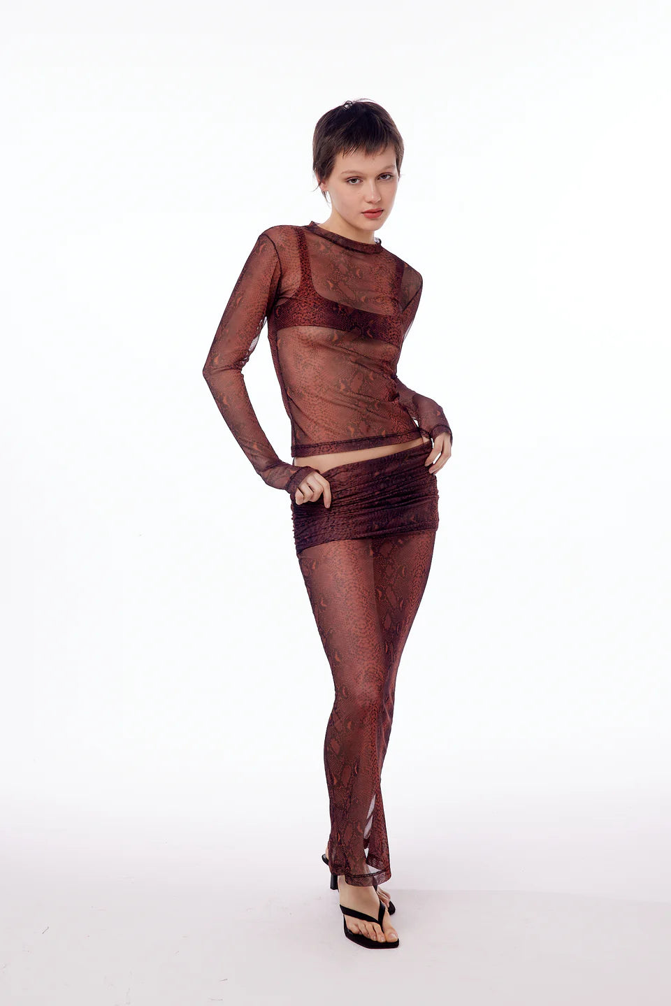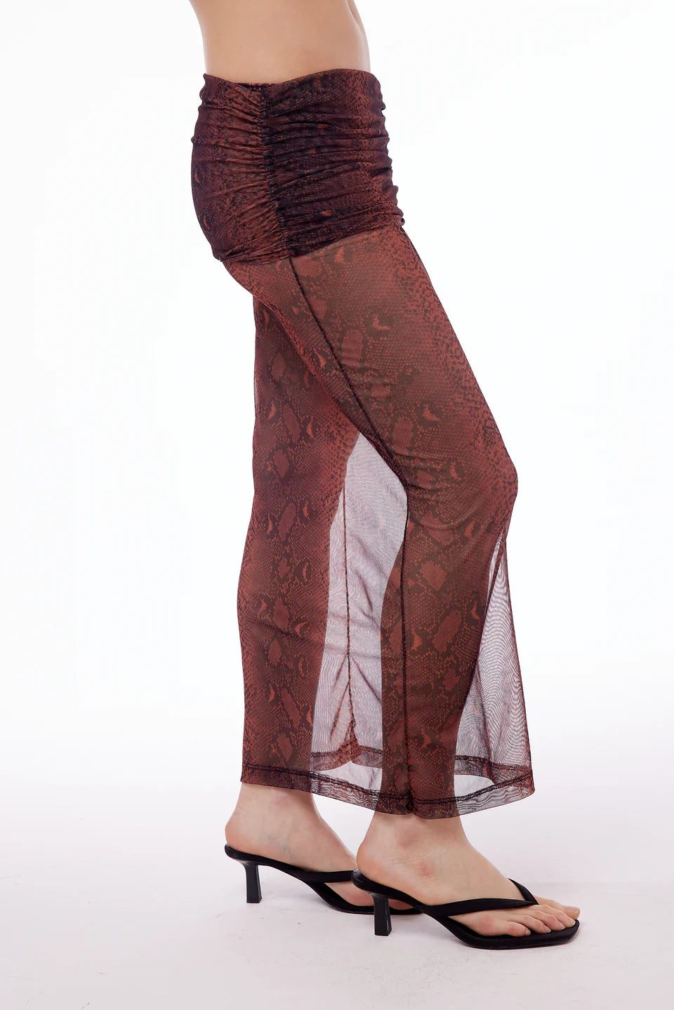 Vestido de microtul con estampa snake brown y con frunce en los laterales. Cuenta con forrería interior en la parte superior de la prenda.